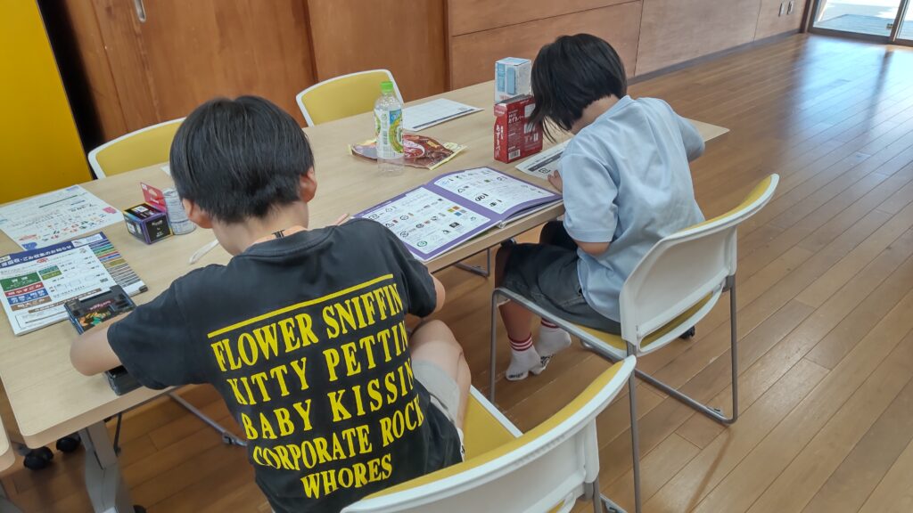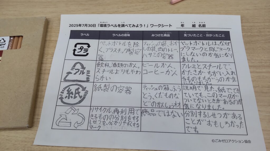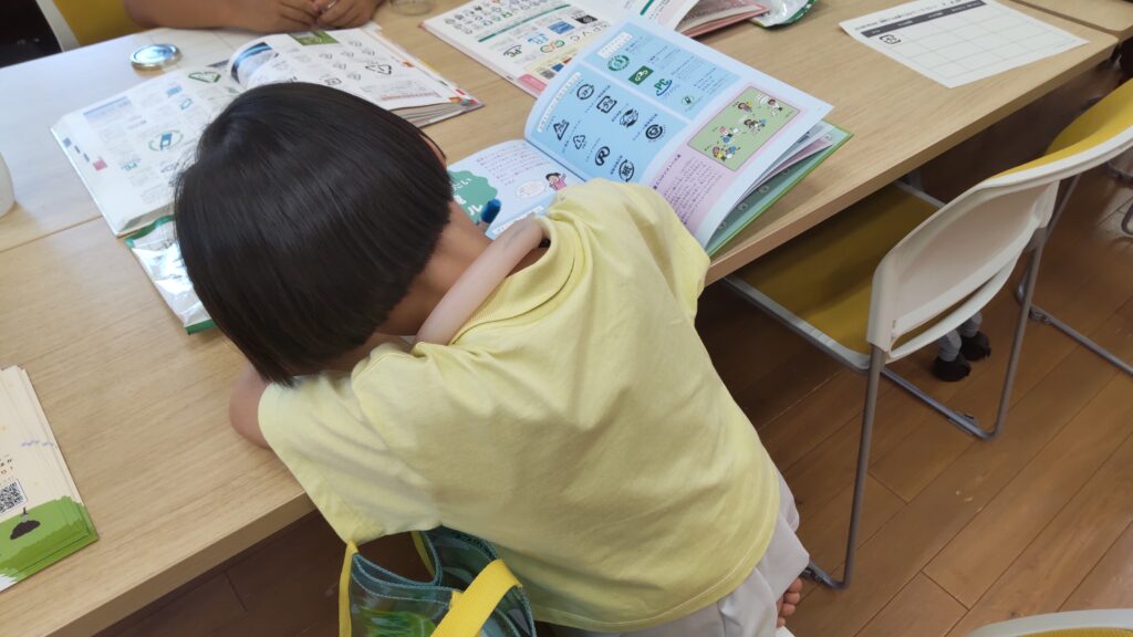 実際に商品パッケージに表示されている環境ラベルについて図鑑や本を用いて調べてもらい、オリジナルの表を作成してもらいました☆