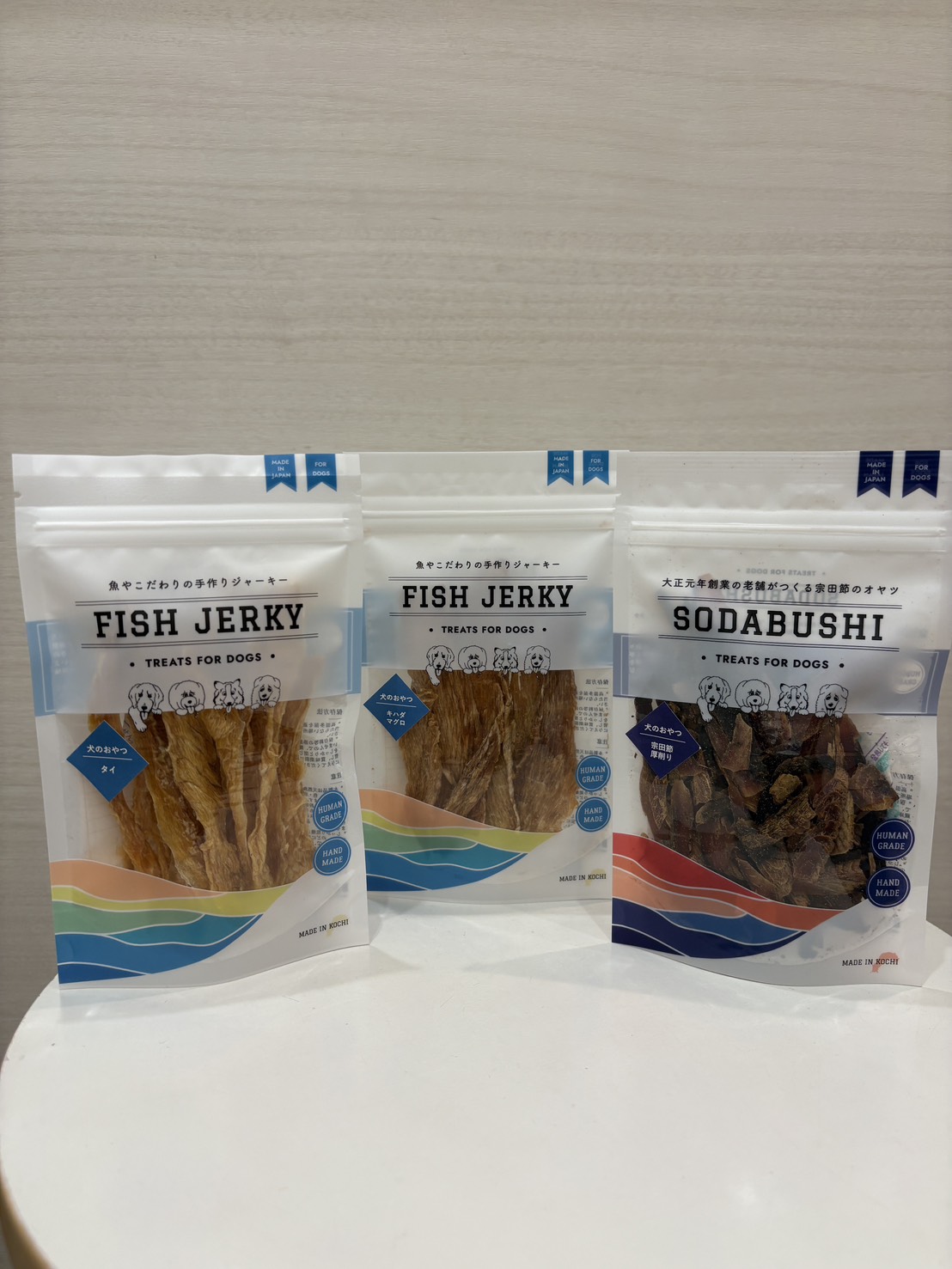 ドライフルーツ、スコーン、クッキー、はちみつ、犬用魚のジャーキー