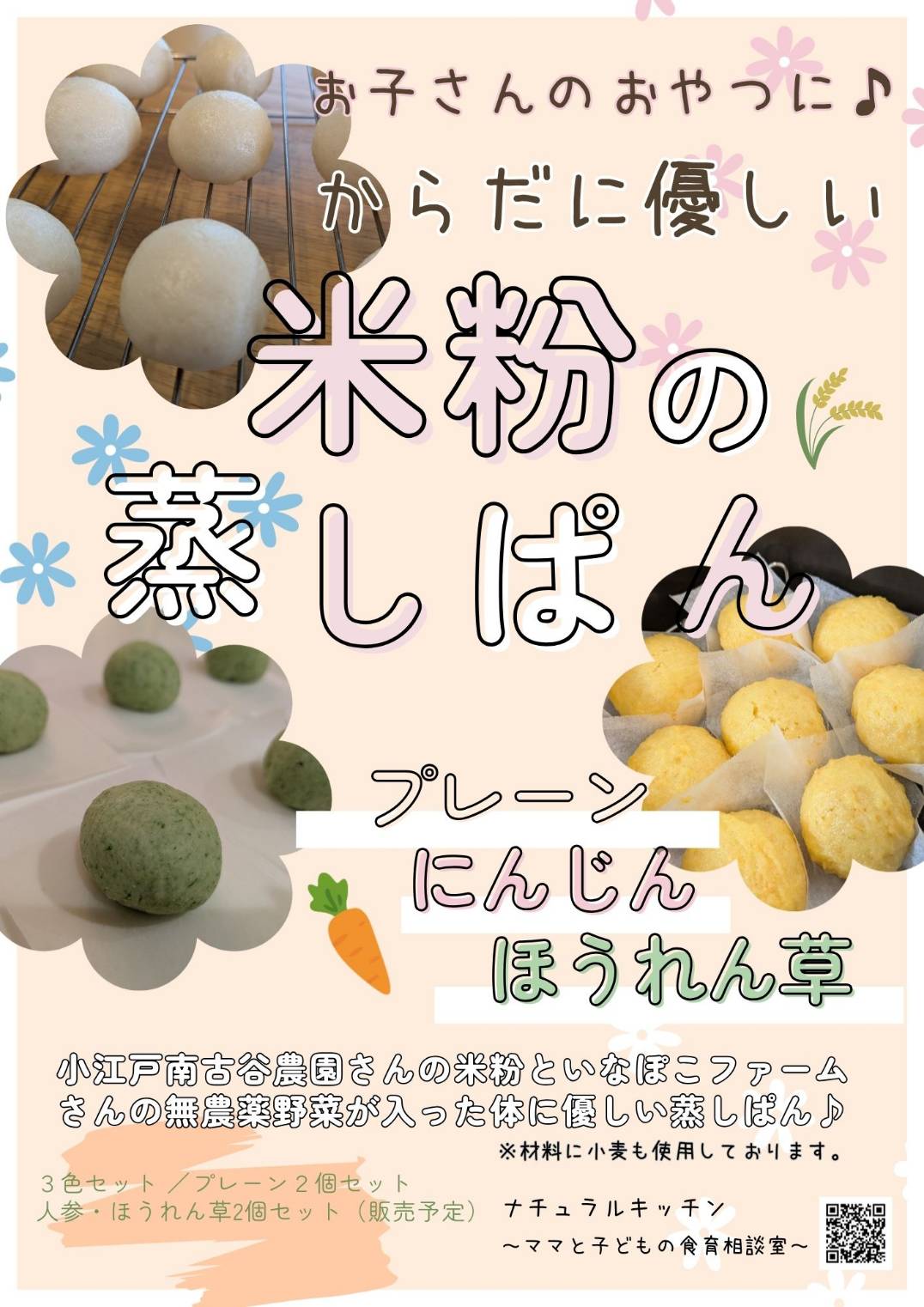 当日は南古谷農園さんの米粉やいなぽこファームさんの無農薬野菜を使った蒸しパンを販売します♪