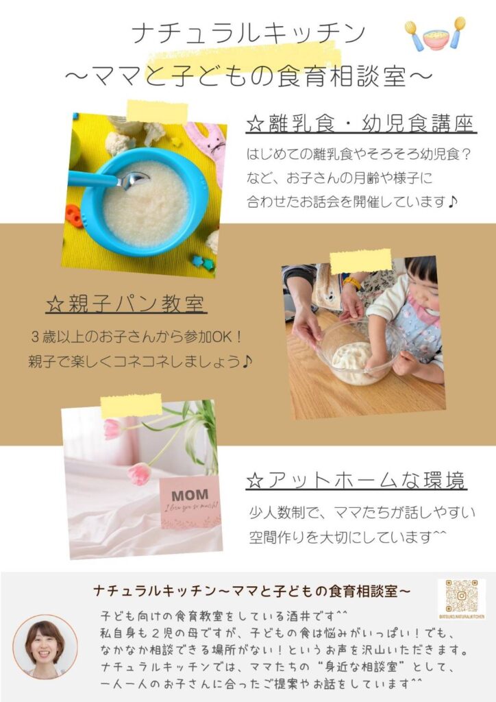 「”食”を通じて子どもたちの健康を守りたい」という想いから、離乳食や幼児食、おやつについての講座や親子パン教室を開催しています☺️