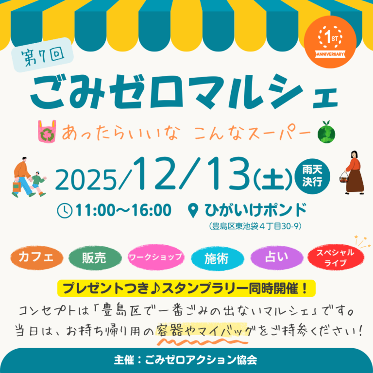 ゼロウェイストマルシェ 【第7回】2025/12/13 ごみゼロマルシェ 「豊島区内で一番ごみの出ないマルシェ」がコンセプトです。地球環境に負荷をかけずに、スーパーマーケットで売っているような日常づかいのものが、容器包装のない状態で買えたらいいなという想いで開催します!当日はご自宅にある容器(タッパー、お弁当箱、空き瓶等)やマイバッグをご持参ください。 プレゼントつき♪スタンプラリー同時開催! 公式Instagram 開催概要 第7回「ごみゼロマルシェ」・日にち:2025年12月13日(土)※屋内のため、雨天決行・開催時間:11:00~16:00・場所:ひがいけポンド(豊島区東池袋4丁目30-9)※東池袋駅から徒歩3分、池袋駅から徒歩12分 出店者リスト nico letter スペシャリティコーヒーの提供と豆販売 あまーにゃ・ちぴ 完全”農薬不使用”栽培の小麦粉を使用した焼菓子の販売 へちま屋さはらん さっぱり&しっとりへちま化粧水の販売 ごみぜろやさん 体にやさしいドライフルーツ・グミの量り売り アロマ香るバスソルト&ルームスプレー作り 安心安全!小さなお子さまから参加OK♪ 心ほどけるヘッドマッサージ*ankake 心と体がふわっとゆるむ深眠タッチセラピー 五葉陽実子 15分2,000円 来年の運気を占います しあわせのつぼ焼き芋 いもぞう 食べ比べが楽しい♪しあわせのつぼ焼き芋3種 ☆1周年企画☆ 蒲田めいさんスペシャルライブ♪ 過去の出店者はこちら 次回(2026/2/8)出店者募集 出店要項・お申込みはこちら